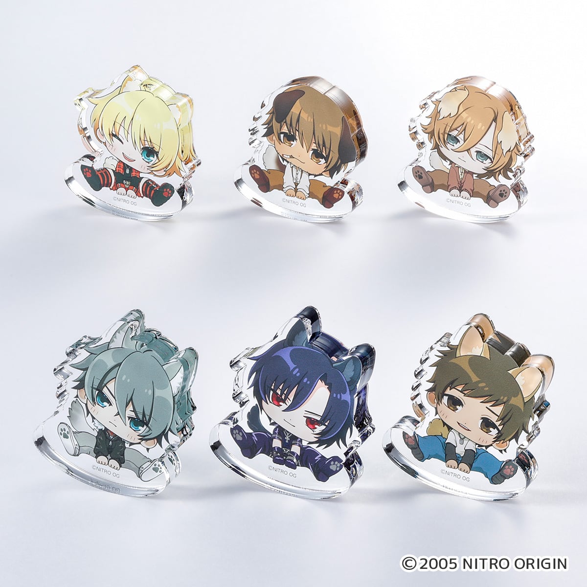 『咎狗の血』のキャラクターたちが、犬をモチーフにした描き起こしイラストで登場!10㎜の分厚いアクリルを使用し、ゆるやかにカーブした底面でゆらゆらと揺れる仕様に。アキラ、ケイスケ、リン、源泉、シキ、nの全6種。かわいらしさあふれる特別なアイテムです。いずれか1種類がランダム封入されており、特定のキャラを選んでの購入はできません。