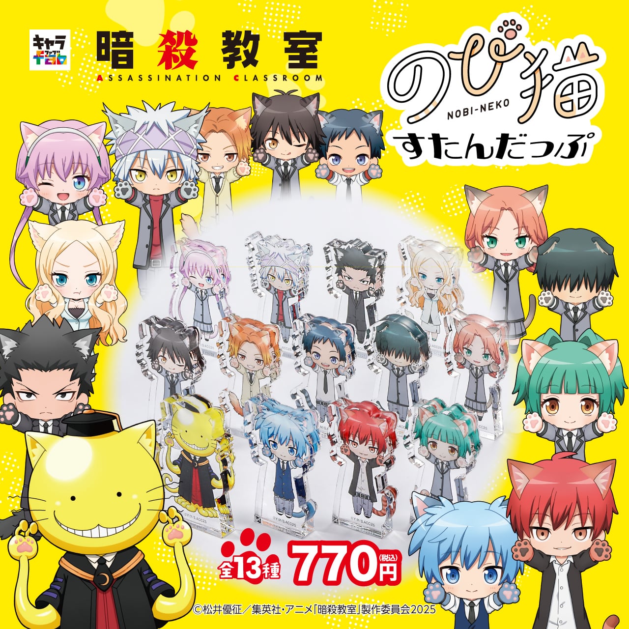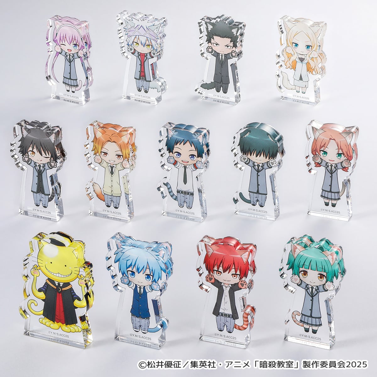 「暗殺教室」のキャラクターたちが大人気"猫のようにゆる〜く伸びたデフォルメイラスト「のび猫」"のちょこっと自立して飾りやすい分厚くかわいいアクリルブロックになりました。