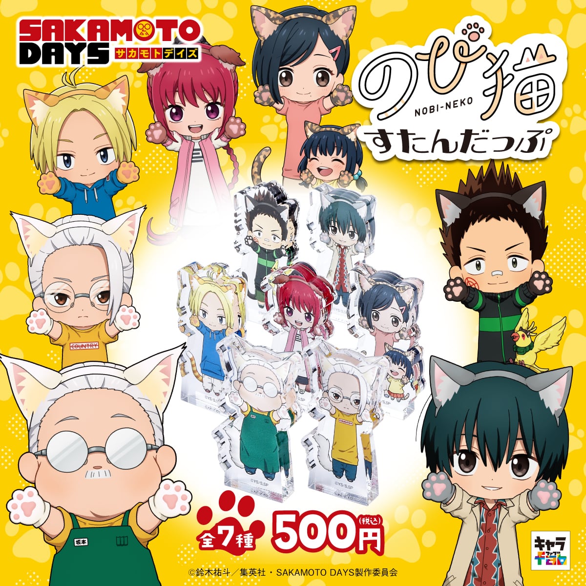 「SAKAMOTO DAYS」のキャラクターたちが大人気"猫のようにゆる〜く伸びたデフォルメイラスト「のび猫」"のちょこっと自立して飾りやすい分厚くかわいいアクリルブロックになりました。